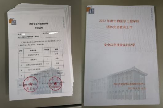 4月27日,同学们还收到了四川大学保卫处和安全应急技能训练中心送来的《消防安全与技能学时证明》和《安全应急技能实训记录》,在惊喜的同时,学院/中心以及所有参训的同学们也对灾后重建与管理学院和保卫处各级工作人员和老师们的辛勤付出表示由衷的感谢。